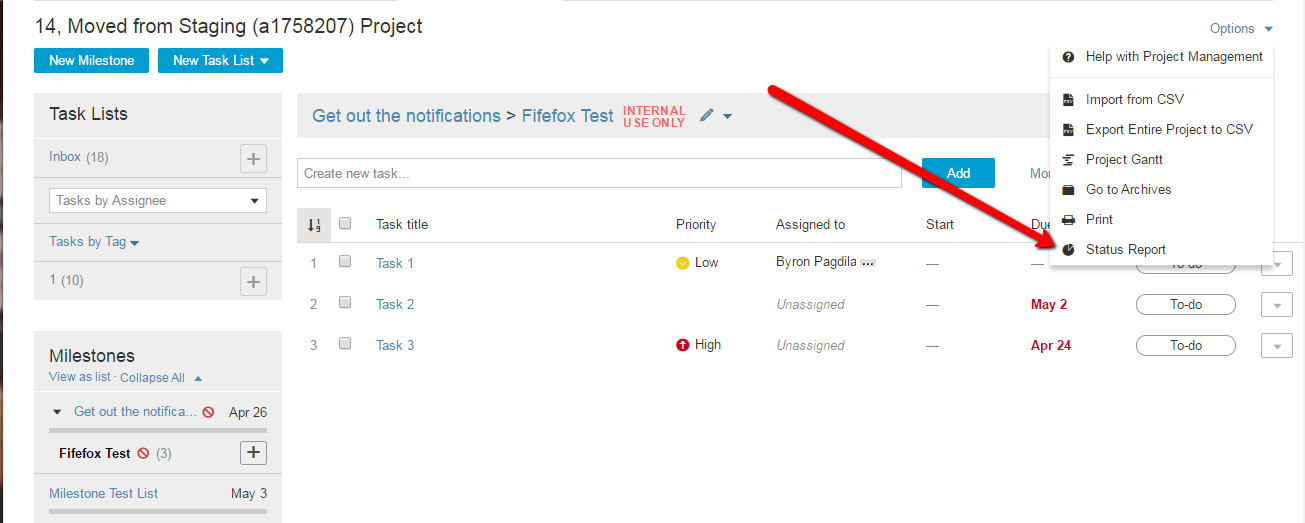 Project Status Reports provide a quick way of checking the progress of tasks and milestones in a workspace. These reports offer a convenient view of the current task completion rate for milestones and task Lists in a workspace. You can easily view all tasks lists and tasks that need to be completed for each milestone, as well as the percentage of total tasks completed for the milestone. Each task list is also listed with the percentage of tasks complete and the tasks appearing below. Note: To see the percent of tasks complete for a milestone, there must be at least one task list associated with it.